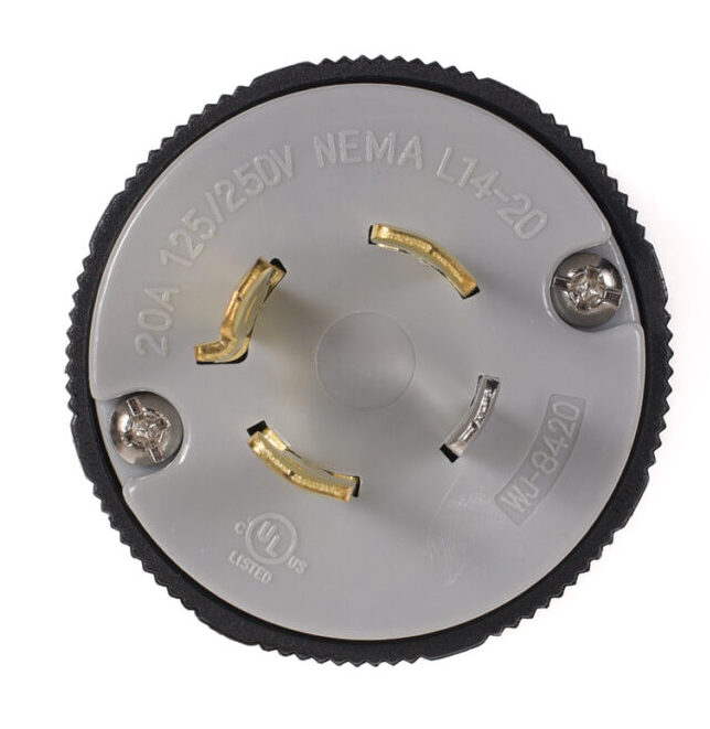 Webber’s NEMA L14-20P, Locking, Attachable Replacement Plug comes with easy-to-follow Installation Instructions. This Locking plug is specifically designed to ensure a secure and reliable connection for all applications. This device features Isolated see-thru Wiring Chambers which helps to prevent arcing & flashover during installation of wires for a solid connection. There is an adjustable rear Cord Clamp for attaching a variety of wire sizes (accepts 18~10 AWG). This Grounded 4 Wire, 20 Amp/125/250 Volt Plug is designed for Commercial and Residential uses. This Wiring Device features high quality, durable nylon construction material and solid brass blades. All our Wiring Devices meet UL, cUL and RoHS standards.
